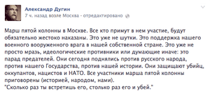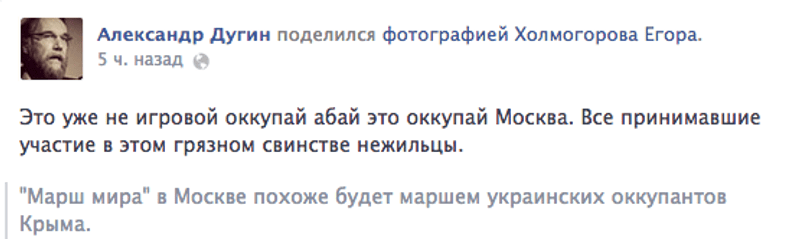 Ну там какая-то "геополитика", демополитика, демонстранты непонятные и пр. Но пусть господин Дугин пояснит какую материальную , моральную и духовную пользу каждому Россиянину даст присоединение Крыма (про "геополитику" не надо). А то, что некоторым, с неустойчивой, или вообще катастрофической, психикой очень хочется убивать, то это их ментальные проблемы, а не общества в котором мы живём.