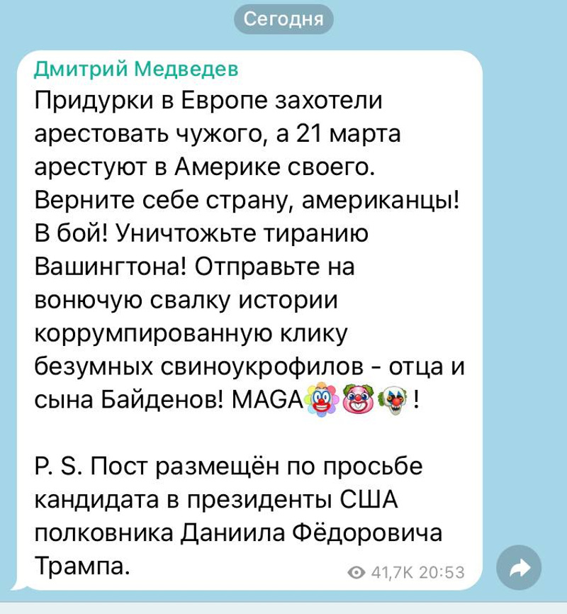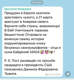 Зампред Совбеза России Медведев призвал граждан США вступить в бой и вернуть себе страну