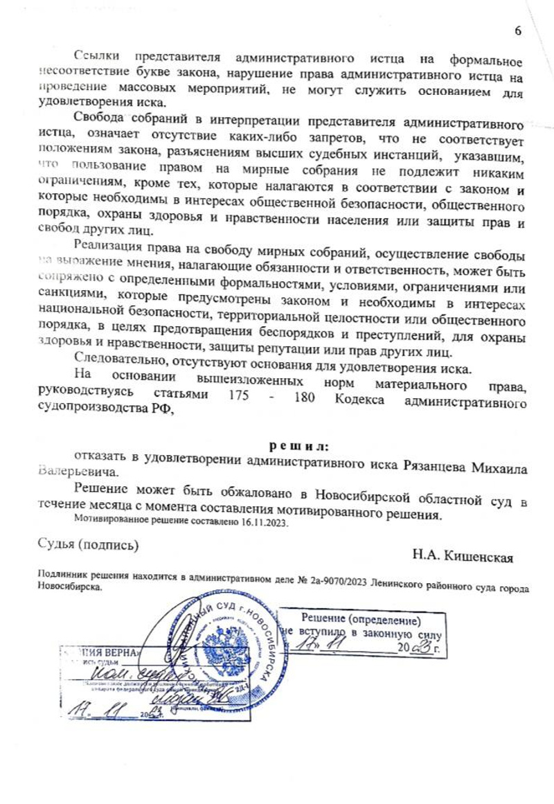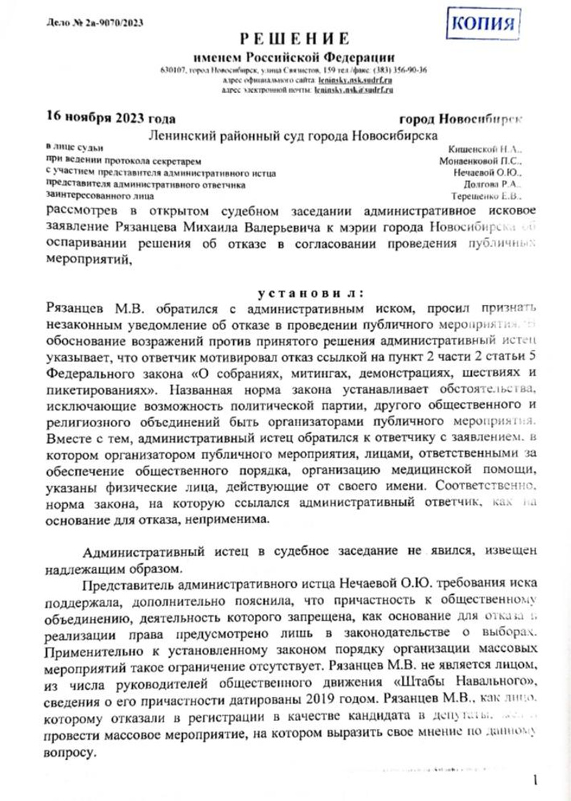 Вчера Ленинский суд отказал мне в иске против мэрии. Мэрия решила, что мне нельзя проводить митинги из-за якобы причастности к деятельности запрещенных организаций. Но в законе прямо сказано что заявлять митинги не могут только запрещенные организации. На физических лиц такие запреты не распространяются.