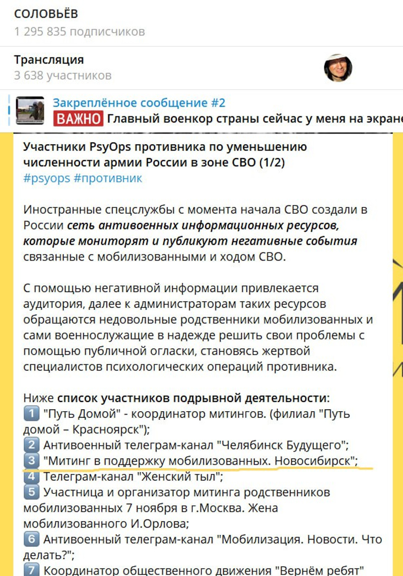 з.ы. СибирьМедиа: Пропагандист Соловьев назвал встречу родственников мобилизованных в Новосибирске провокациями ЦИПСО.