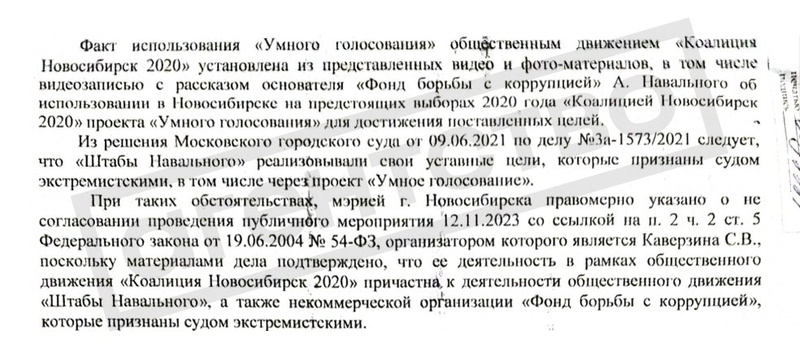 ▪️Однако судья Мария Стебихова посчитала, что связь между Каверзиной и структурами все-таки есть. В своем решении по иску она сослалась на письмо из центра «Э» регионального главка МВД в мэрию Новосибирска. В этом документе полиция обосновала связь Каверзиной с ФБК и Штабами Навального тем, что во время выборов в горсовет Новосибирска в 2020 году независимое объединение кандидатов «Коалиция 2020», от которого баллотировалась Каверзина, поддержал проект «Умное голосование». «В ходе данной избирательной кампании актив движения "Коалиция Новосибирск 2020" использовал проект "Умное голосование", что подтверждается видеозаписью, записанной во время пребывания в Новосибирске оппозиционного деятеля Навального», — говорится в решении суда.