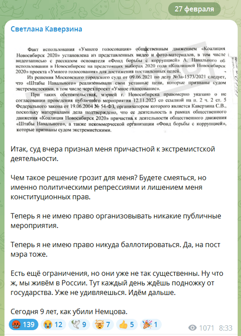 ▪️21 февраля мэрия отклонила заявку, сославшись на то, что Каверзина якобы «причастна» к деятельности Штабов Навального и Фонда борьбы с коррупцией, признанных властями экстремистскими организациями. По российскому законодательству, запрещенные организации и их структуры не могут быть организаторами митингов.