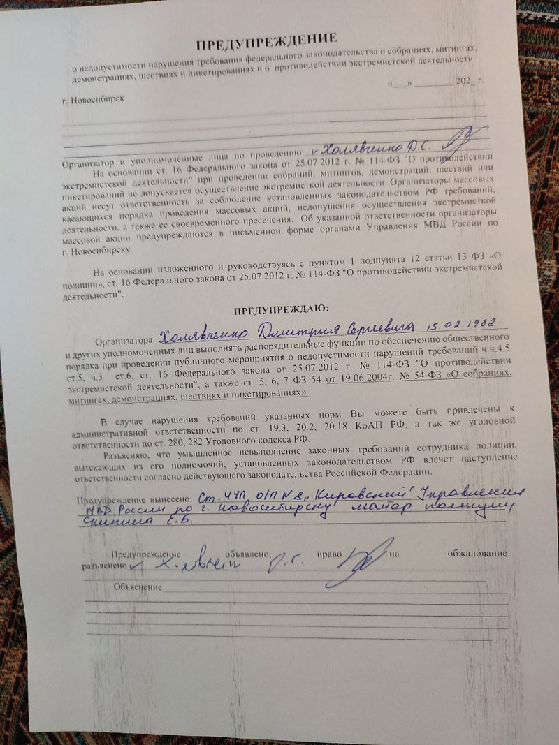 Во-вторых, вот, предупреждение моему помощнику Дмитрию Холявченко. Его априори назначили организатором некой акции без времени и даты. Любое нарушение кем-то когда-то правил публичных мероприятий для Дмитрия может повлечь административку и штраф/арест.