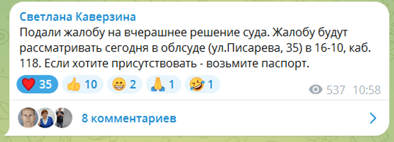 Подали жалобу на вчерашнее решение суда. Жалобу будут рассматривать сегодня в облсуде (ул.Писарева, 35) в 16-10, каб. 118. Если хотите присутствовать - возьмите паспорт.