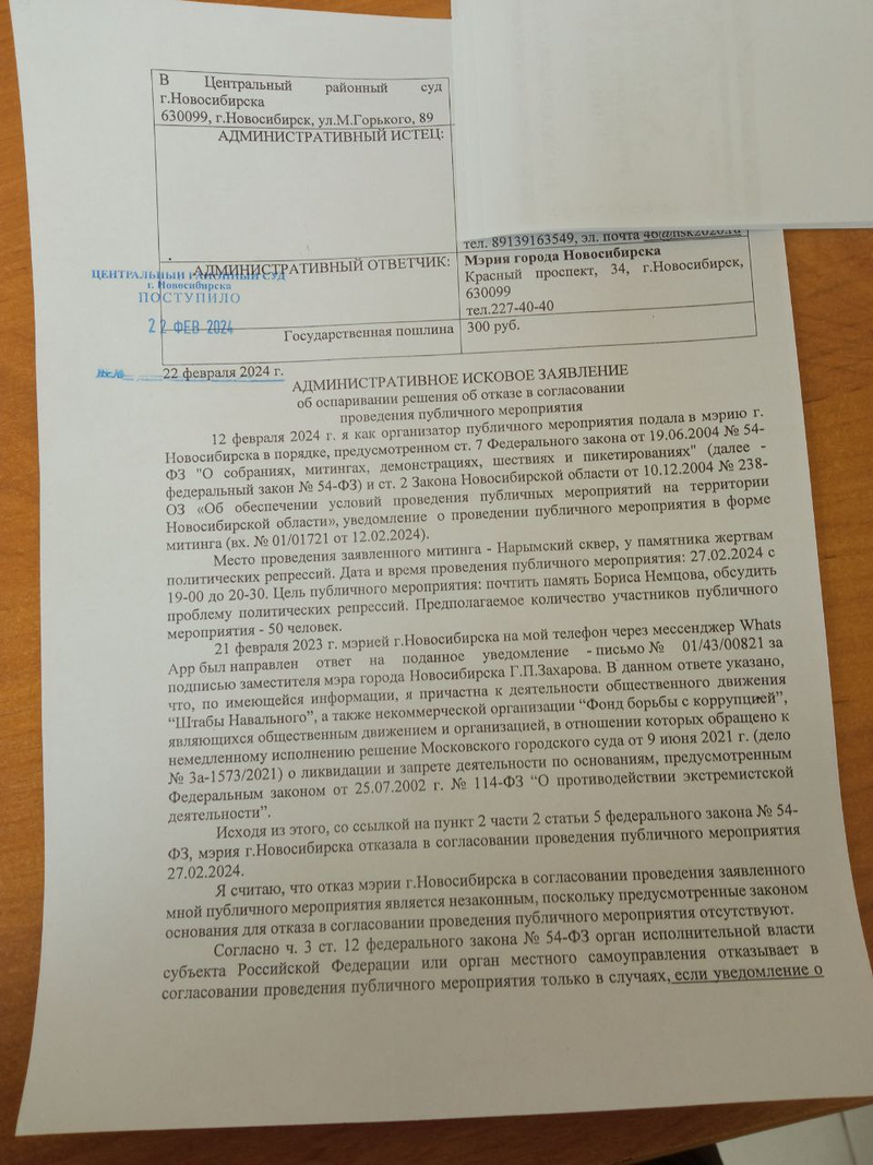 Заявление в суд по поводу отказа мне в митинге подала.